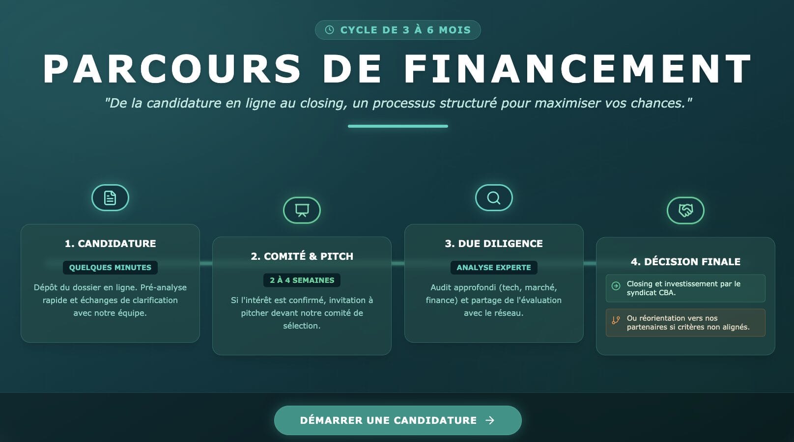 En quelques minutes, vous pouvez déposer votre dossier pour une pré‑analyse, une présentation à nos membres experts puis un pitch si l’intérêt est confirmé, avec une due diligence collective et un objectif de closing en 3 à 6 mois ; l’accompagnement initial est 100% gratuit, les projets hors critères ou trop early‑stage sont réorientés vers nos partenaires ou aidés à structurer leur levée, et nous privilégions les startups ayant une première traction commerciale (contrats, revenus, lettres d’intention) ou un niveau de maturité technologique d’au moins TRL 7 pour les DEEPTECH.