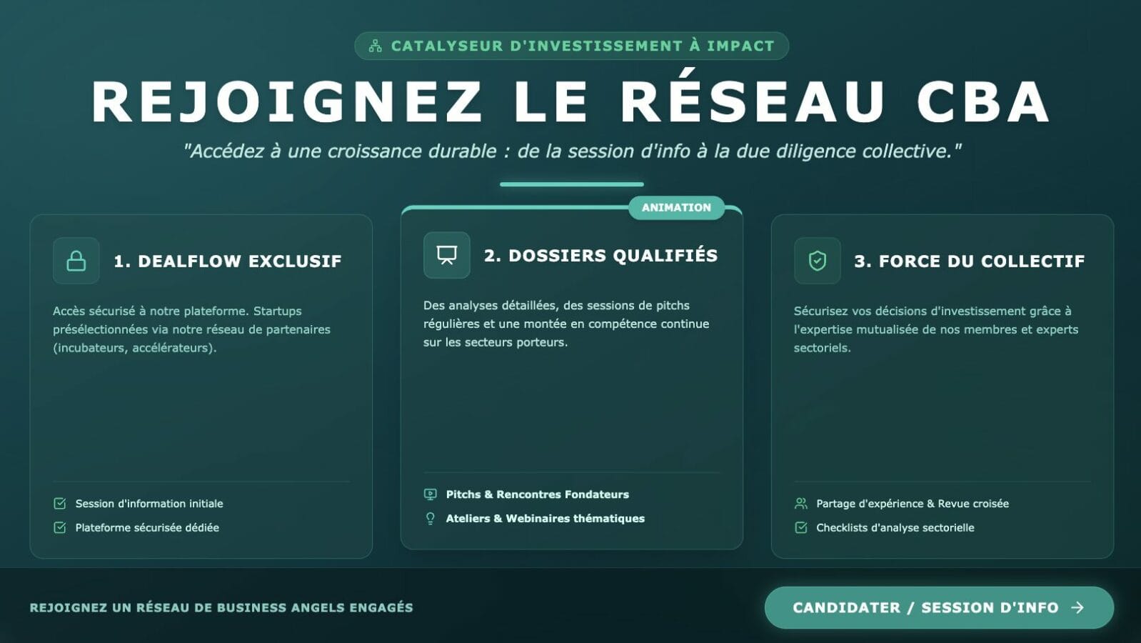 Rejoignez Cleantech Business Angels, un réseau privé d’investisseurs à impact et accédez à un dealflow cleantech qualifié, structuré de la première prise de contact jusqu’aux décisions d’investissement, avec des dossiers sourcés auprès de partenaires spécialisés, analysés et pitchés, ainsi que des ateliers thématiques et une due diligence collective d’experts pour affiner votre thèse, tout en restant libre d’investir à votre rythme et selon votre ticket. En rejoignant le réseau, vous contribuez directement au financement de startups qui accélèrent la transition énergétique et écologique.