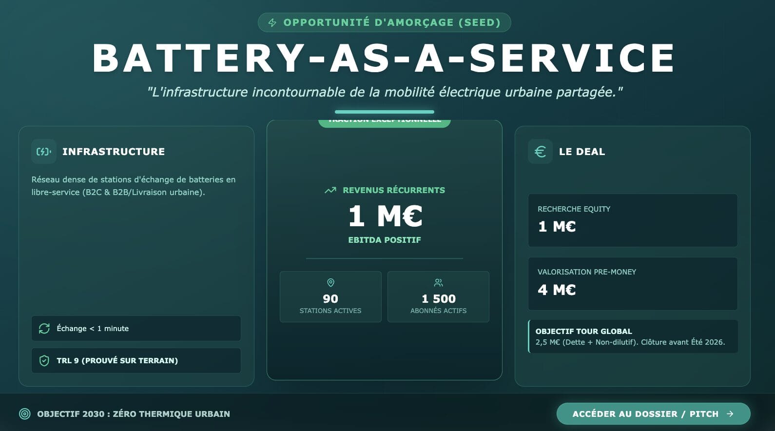 - Financements & Traction : La Cible démontre une traction exceptionnelle avec d’ores et déjà 1 million d’euros de revenus récurrents annuels (ARR) et un EBITDA positif. Le service compte 1 500 abonnés actifs et exploite un réseau de 90 bornes fonctionnelles, adossé à un stock matériel massif (plusieurs milliers de scooters et de batteries) prêt à être déployé.